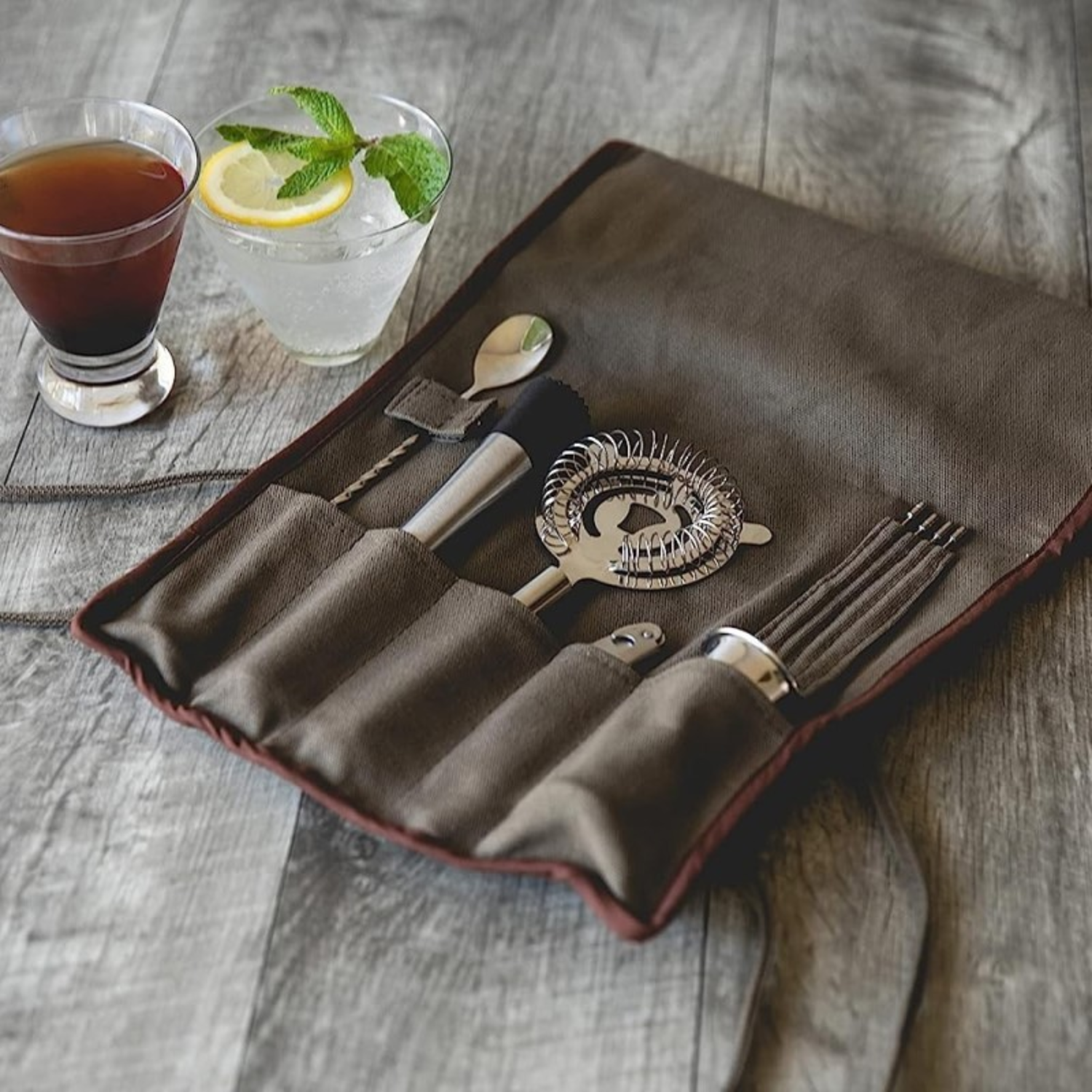 Perfect for the roaming mixologist, the 10-piece Bar Tool Roll Up Kit is a highly-portable and packable waxed-canvas roll-up bar tool set containing: four cocktail sticks, one double-sided jigger (1 oz./1.5 oz.), one brushed muddler with plastic head, one hawthorne strainer, one dual leverage waiter-style corkscrew, and one twisted-stem cocktail spoon with hammer. Bring the bar with you whether you're camping, glamping, picnicking, or at home.