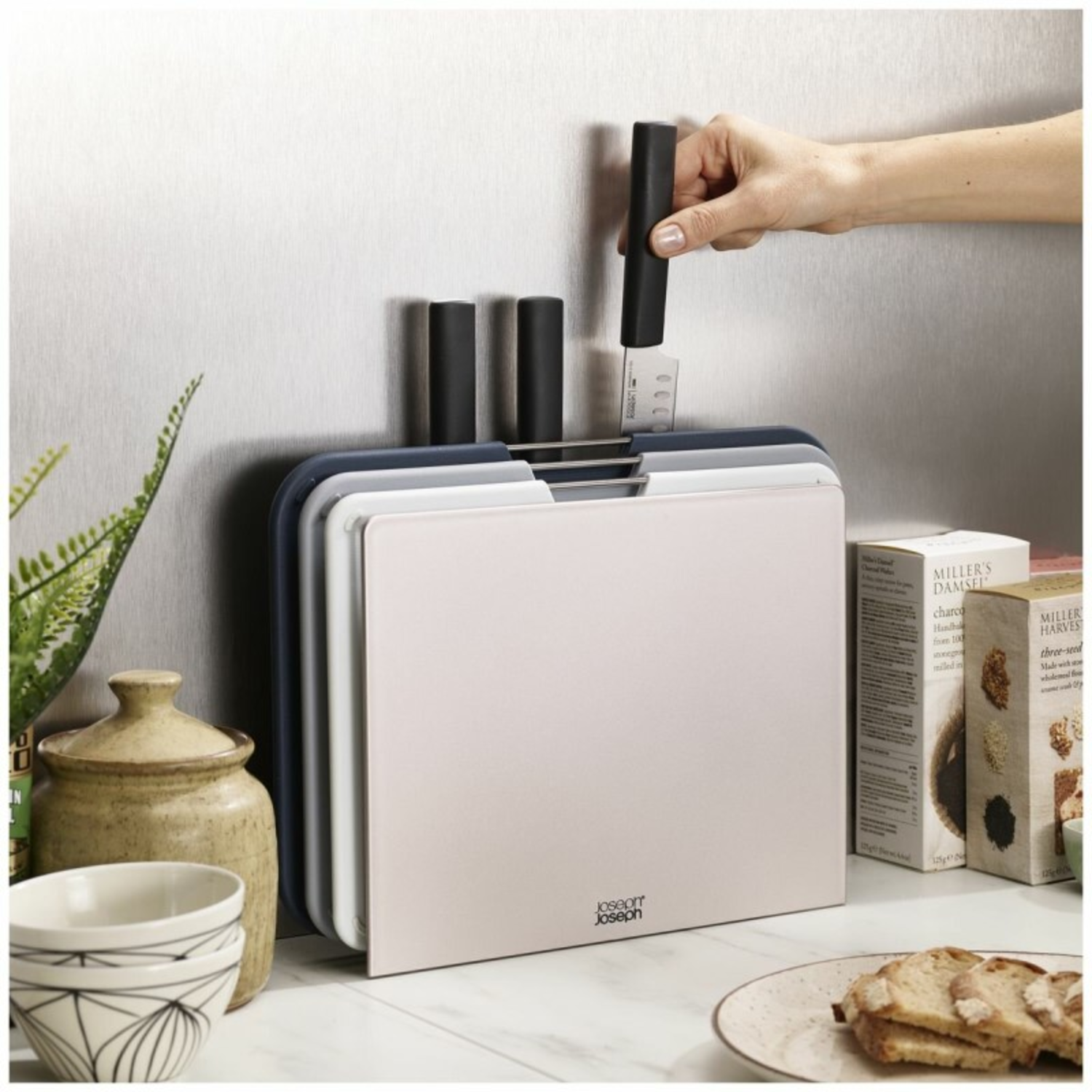 This smart set includes three colour-coded chopping boards, three essential kitchen knives and a sleek storage stand to keep them neatly stored on your worktop. Colour-coded chopping boards with non-slip feet Knives with sharp stainless-steel blades and soft-grip handles Organized, space-saving storage stand Board sizes: Small 23 x 32cm (9 x 12½ inches); Medium 24 x 34cm (9½ x 13⅜ inches); Large 25 x 35.5cm (9⅞ x 14 inches) Knives: 6½” (15.5cm) Chef’s knife, 5½” (14cm) Santoku knife, 4” (10cm) Paring knife
