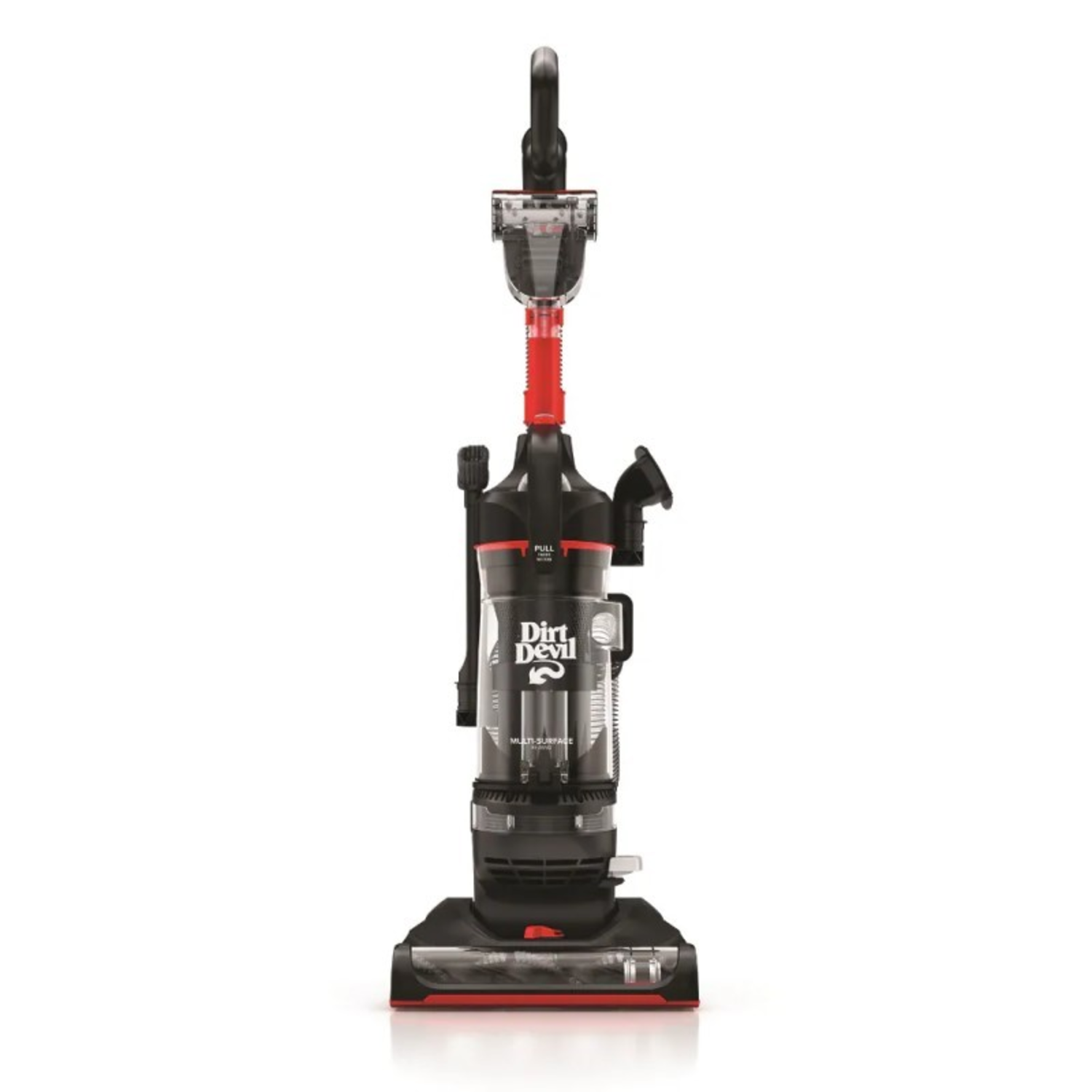 The Dirt Devil Multi-Surface Rewind+ uses powerful suction for effective cleaning across all floor types. The above-floor extension wand uses Click Lock™ tools to reach messes on upholstery, shelves, stairs and more. PowerPass™ technology helps prevent dirt and dust scatter on hard floors, and Extended Life Filtration keeps dirt and debris in the filter and out of the air for a more thorough clean. The easy-empty dirt cup makes the trip to the trash quick and simple, and the cord quickly retracts with the touch of a button, making storage a breeze.