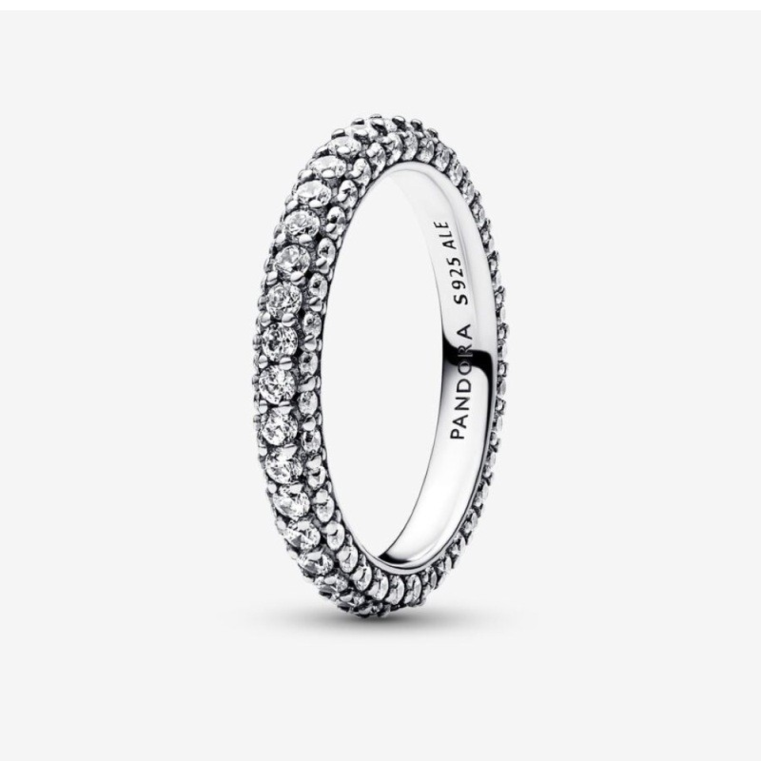 Stackable, radiant, timeless. Crafted from sterling silver, this hand-finished Pandora Timeless Pave Single-Row Ring features one row of clear cubic zirconia around the center and one row facing outwards around each side, creating a slightly rounded square profile that sparkles from every angle. Style it on its own or with other Timeless Pave pieces to create as much of a minimalist or maximalist effect as you want. This ring is a size 6.