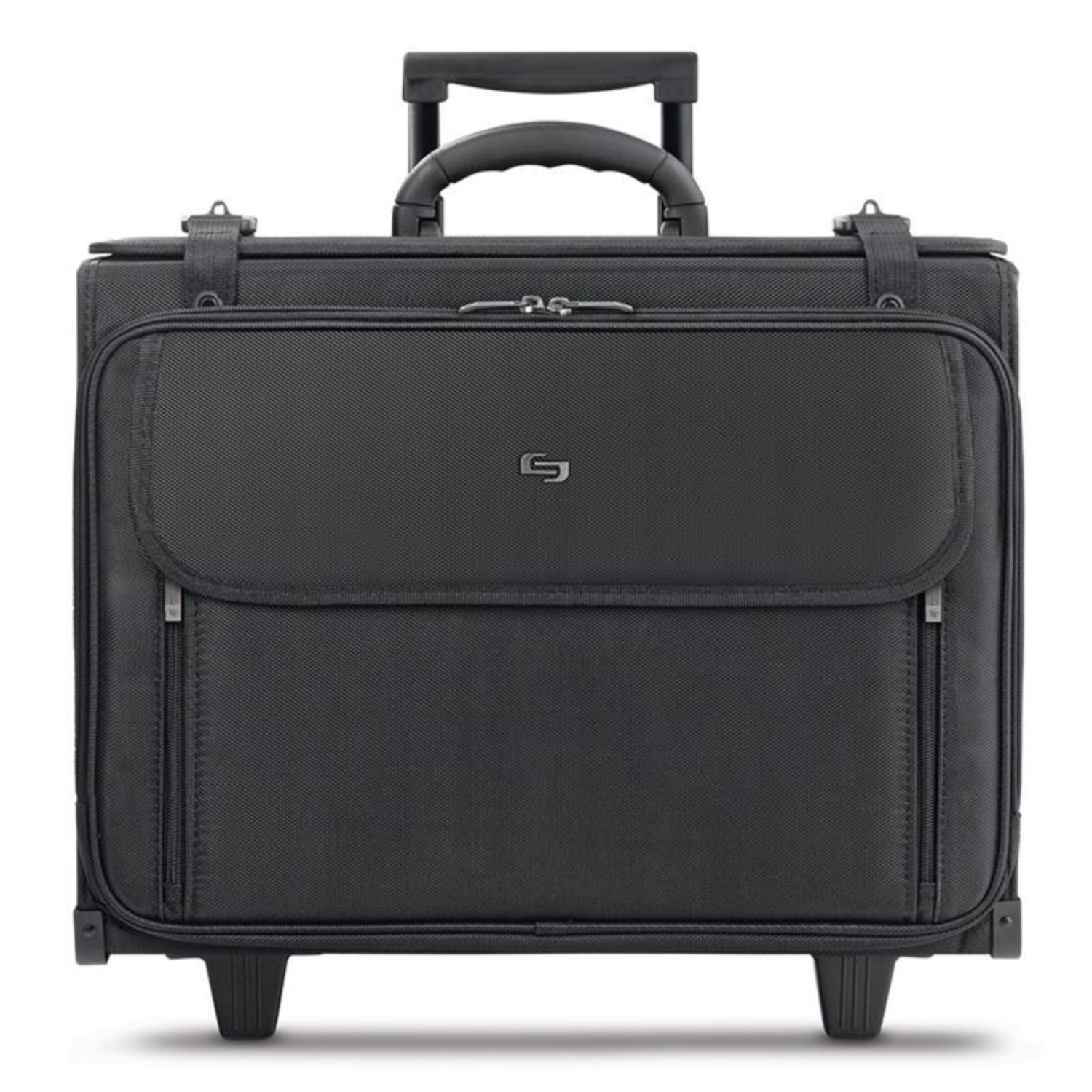 Hanging file system. Removable fully padded 17.3' laptop sleeve. Checkpoint friendly sleeve design allows you to pass through airport security faster. Full size front zip-down organizer section and file compartment. Sturdy carry handle. Telescoping handle system. Speed buckle closure.